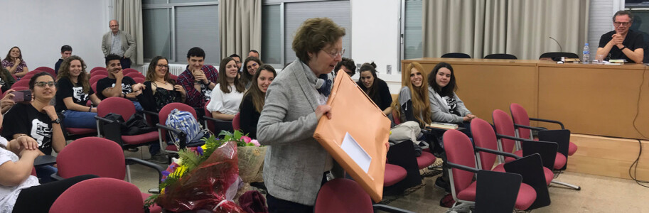 Comiat de la professora Maria Campillo 10 maig, 2018 | Assemblea FILCAT, Notícies, Professorat En el marc de la VI Jornada FilCat, vam celebrar el comiat de la professora Maria Campillo, que es jubila enguany Maria Campillo, sobre ensenyar literatura: «per a mi ha estat un privilegi haver pogut fer de l’addicció als llibres una professió»