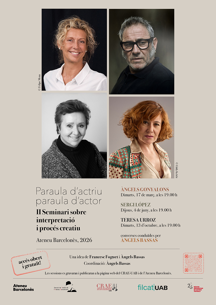 Després del gran èxit de públic en la primera edició, engeguem el II Seminari sobre interpretació i procés creatiu, «Paraula d’actriu – paraula d’actor» del CRAE-UAB. Concebut en un format de tertúlia, que condueix i coordina l’actriu i escriptora Àngels Bassas, disposarà de la participació d’actors i actrius reconeguts del país i de gran prestigi internacional.